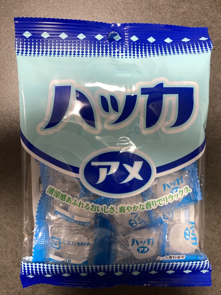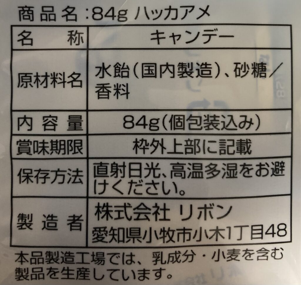 株式会社リボンが製造する「ハッカアメ」は、昔ながらのシンプルなキャンディです。私はダイソーで購入しましたが、税込108円という手頃な価格で手に入ります。