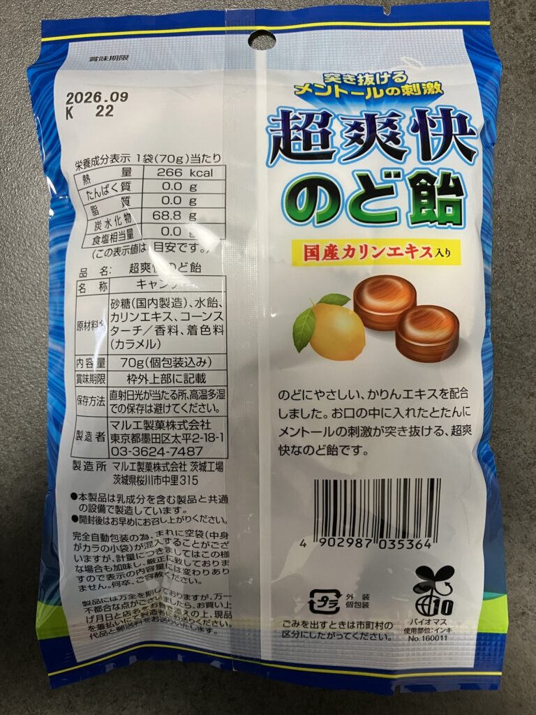 「のど飴」というより、メントールキャンディ寄りの体感。